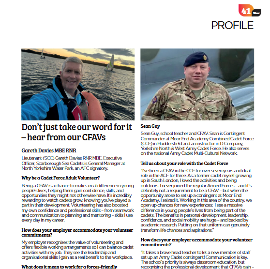 CFAVs Gareth Davies and Sean Guy were recently featured in the latest issue of North and West Yorkshire Chamber of Commerce Business magazine sharing what it means to be a volunteer with the Cadet Force and the benefits of giving back to their communities. The magazine is distributed to employers and organisations throughout the region and promotes programmes and businesses. Gareth is a CFAV with Scarborough Sea Cadets and Sean leads Moor End Academy CCF and instructor with Yorkshire North & West Army Cadet Force.